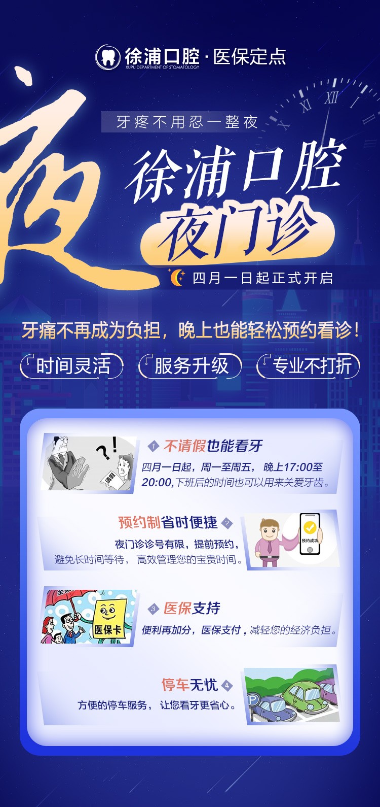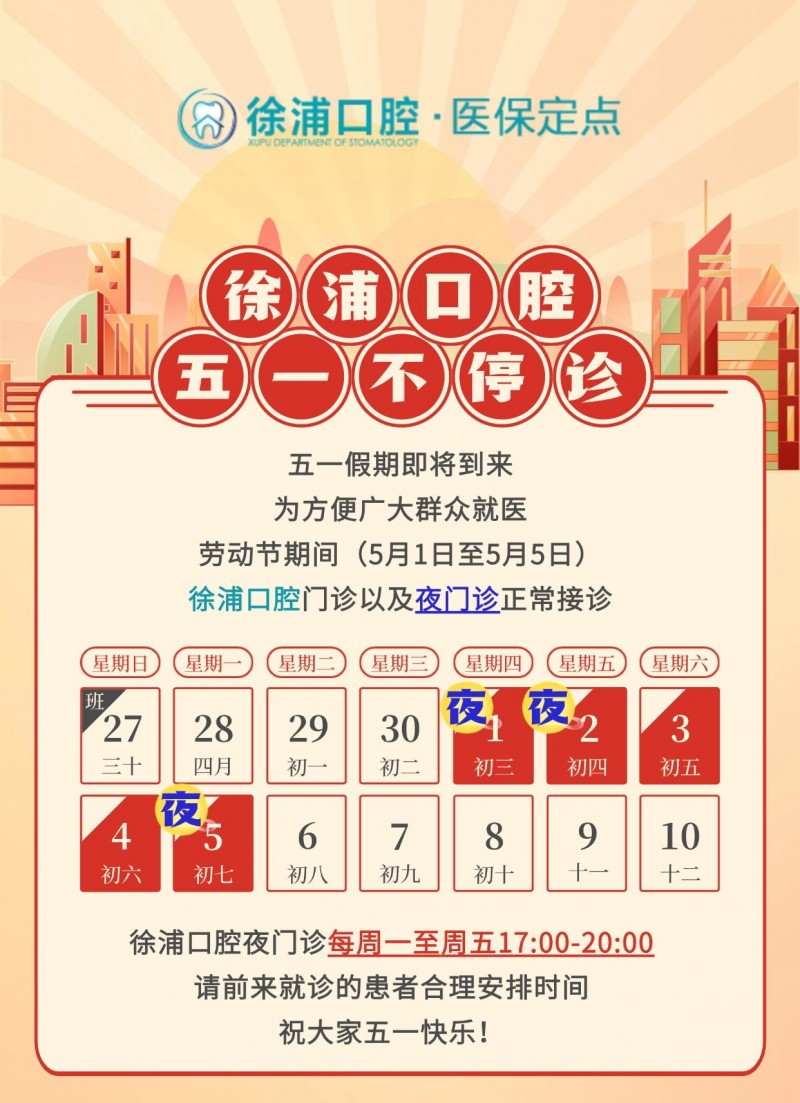 在徐浦口腔,時(shí)間從不是健康的障礙——無論是五一假期的全家總動(dòng)員,還是深夜加班后的牙痛急診,這里總有一盞燈為您而亮,總有一雙手為您解憂。