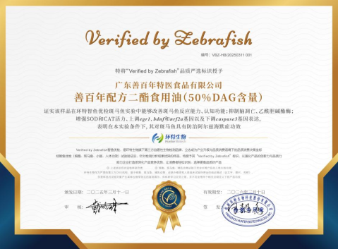 環(huán)特生物證實(shí):在該實(shí)驗(yàn)條件下,由廣東善百年特醫(yī)食品有限公司提供的善百年配方二酯食用油(50%DAG含量)具有防治阿爾茲海默癥功效,具體表現(xiàn)為對(duì)反應(yīng)能力的改善、對(duì)認(rèn)知功能的改善、腦凋亡的抑制、乙酰膽堿酯酶抑制、增強(qiáng)SOD和CAT活力、上調(diào)egr1、bdnf和nrf2a基因以及下調(diào)caspase3基因表達(dá)。