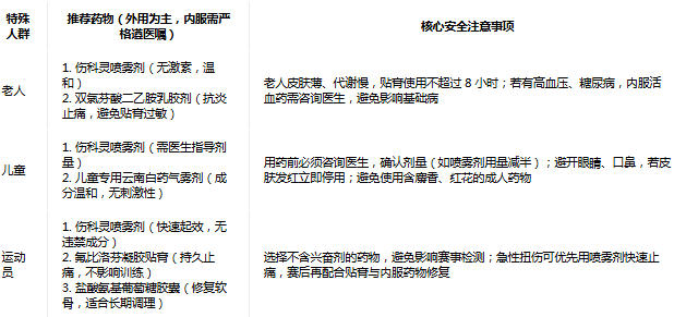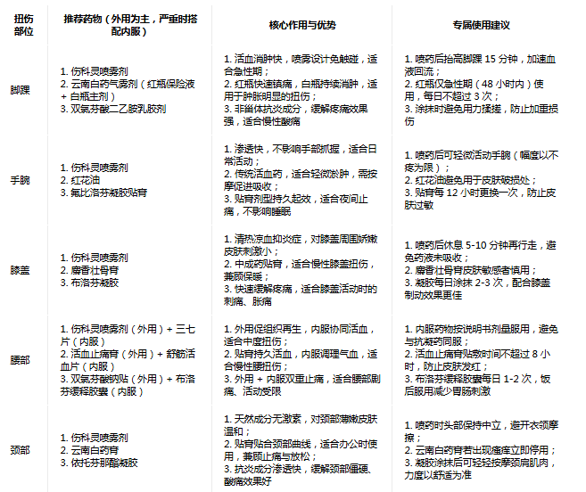 外用:傷科靈噴霧劑(1 小時內(nèi)噴藥,快速滲透)、云南白藥氣霧劑紅瓶(緊急鎮(zhèn)痛,48 小時內(nèi)使用)